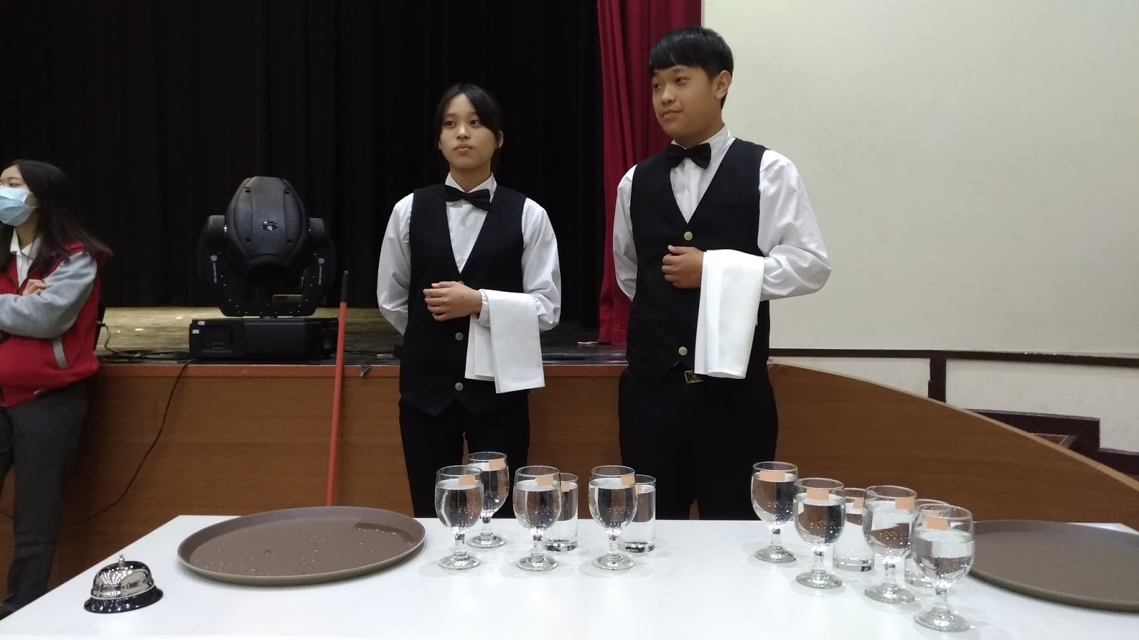 本次比賽除了技巧,也要求速度,因此托盤的行走步伐更是比賽的重點,智光商工觀光科林惠明主任進一步現場示範叮嚀托盤的使用方法和技巧:
